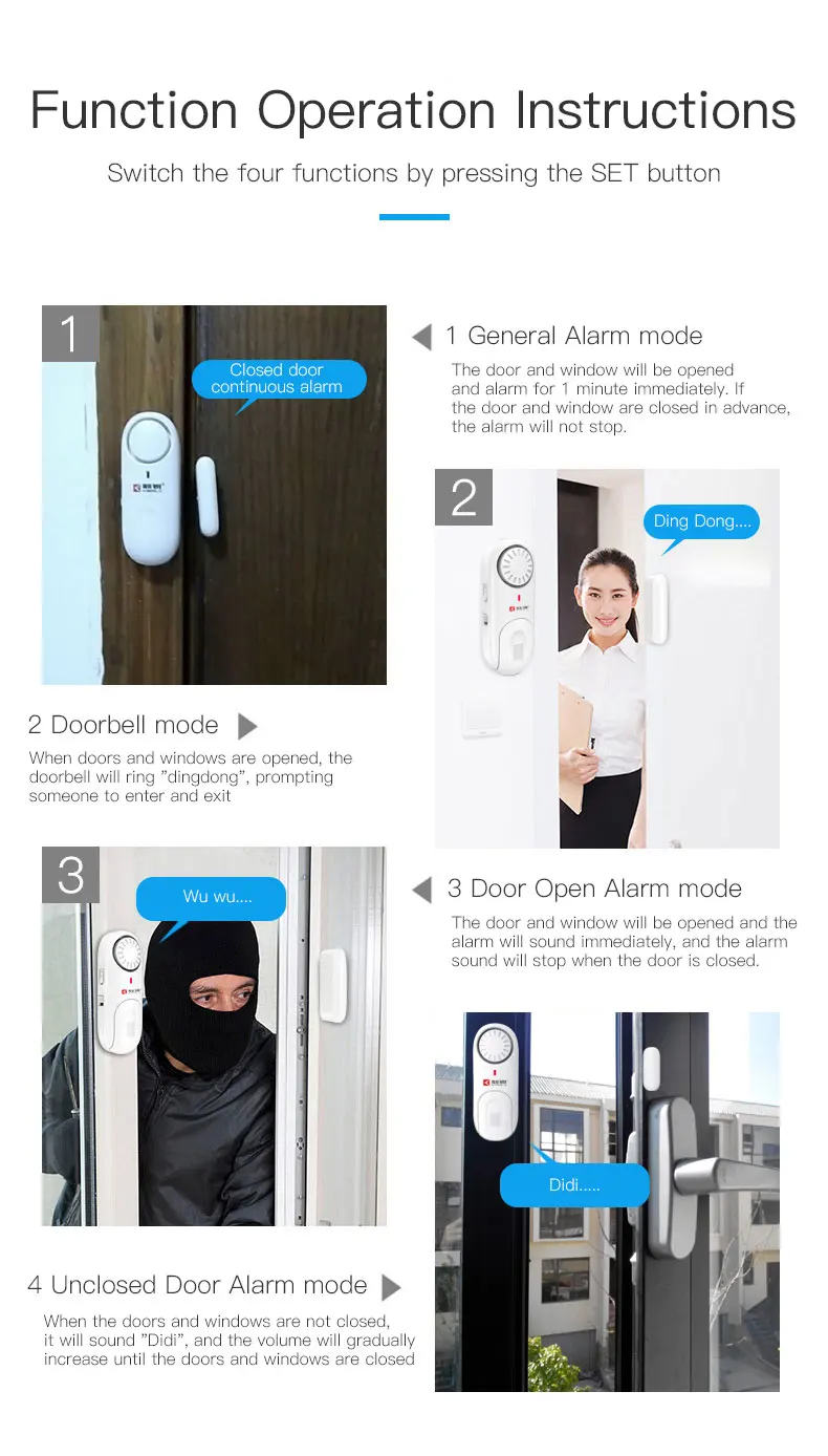 | Function | Home security, Burglar Alarm, Protect Kids,Doorbell |