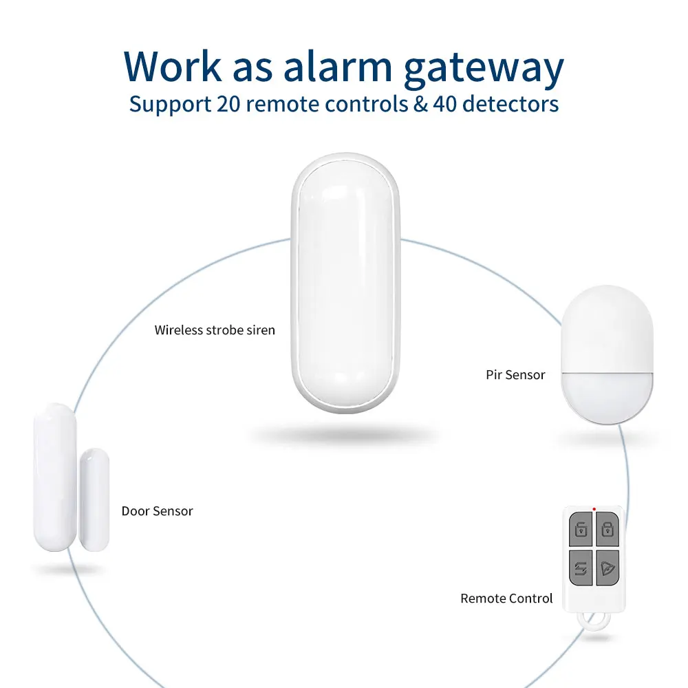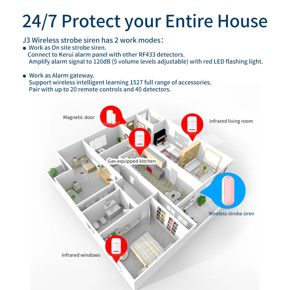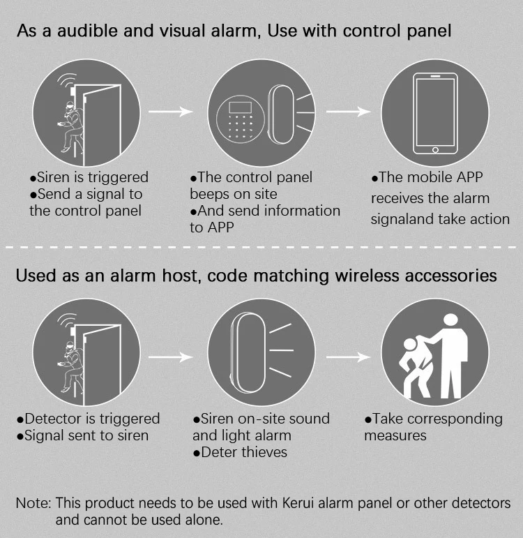 On site loud alarm 120dB & Red LED light; Send signal to alarm host.